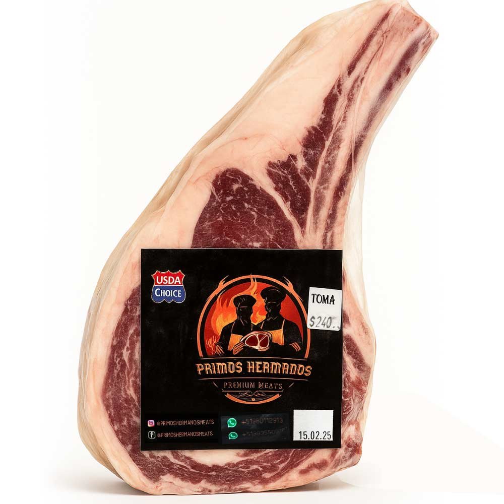 El Tomahawk americano High Choice de Primos Hermanos Meats es un corte de res premium, demarmoleado perfecto, proveniente del lomo alto con un hueso largo que realza su presentación. Su excelente